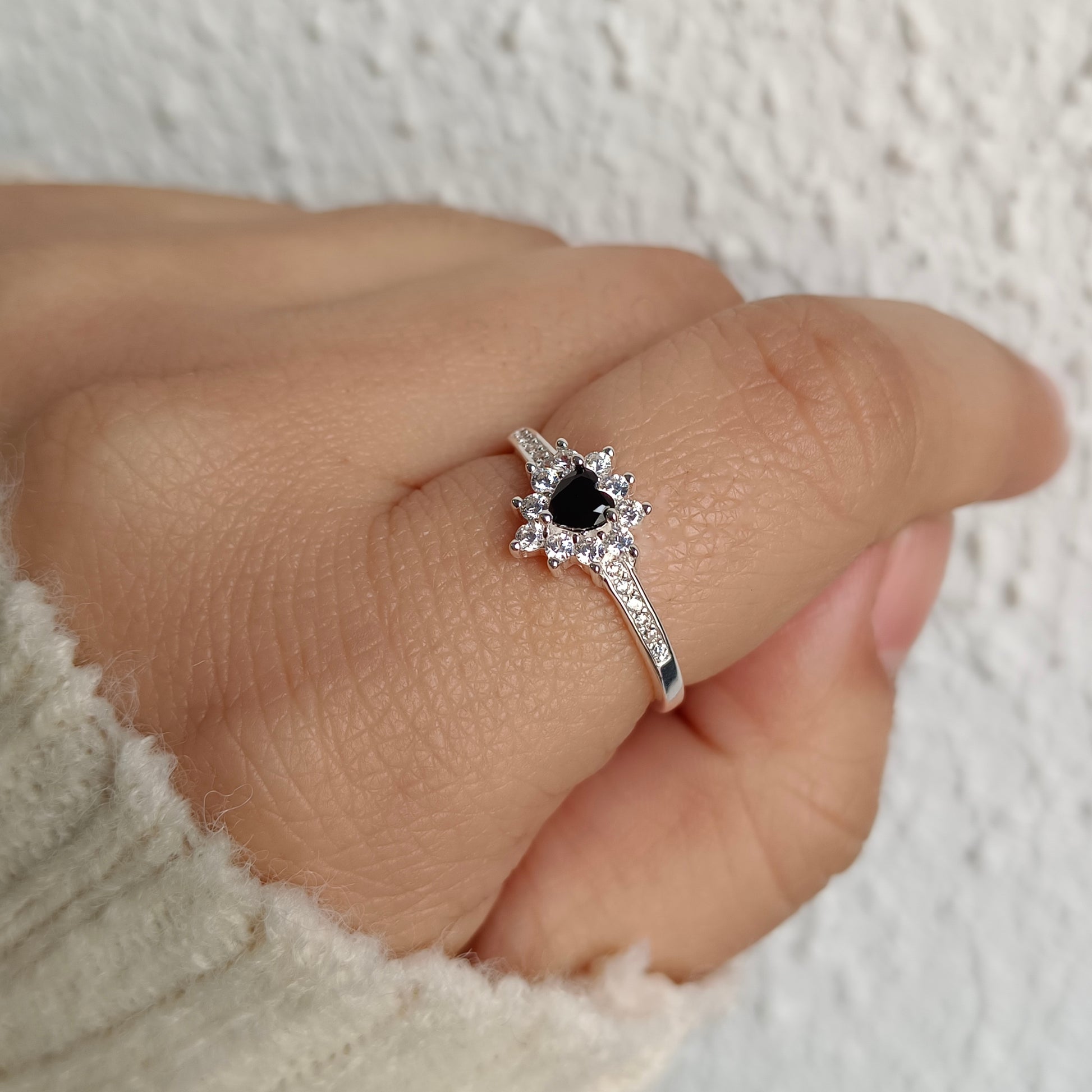 Un diseño impactante que destaca por su elegancia y personalidad. Este anillo presenta un corazón negro central rodeado de brillantes circones, todo ello sobre una banda pulida en Plata Fina Ley 925.
