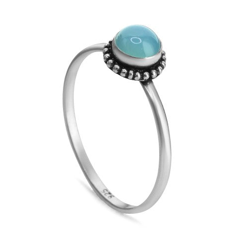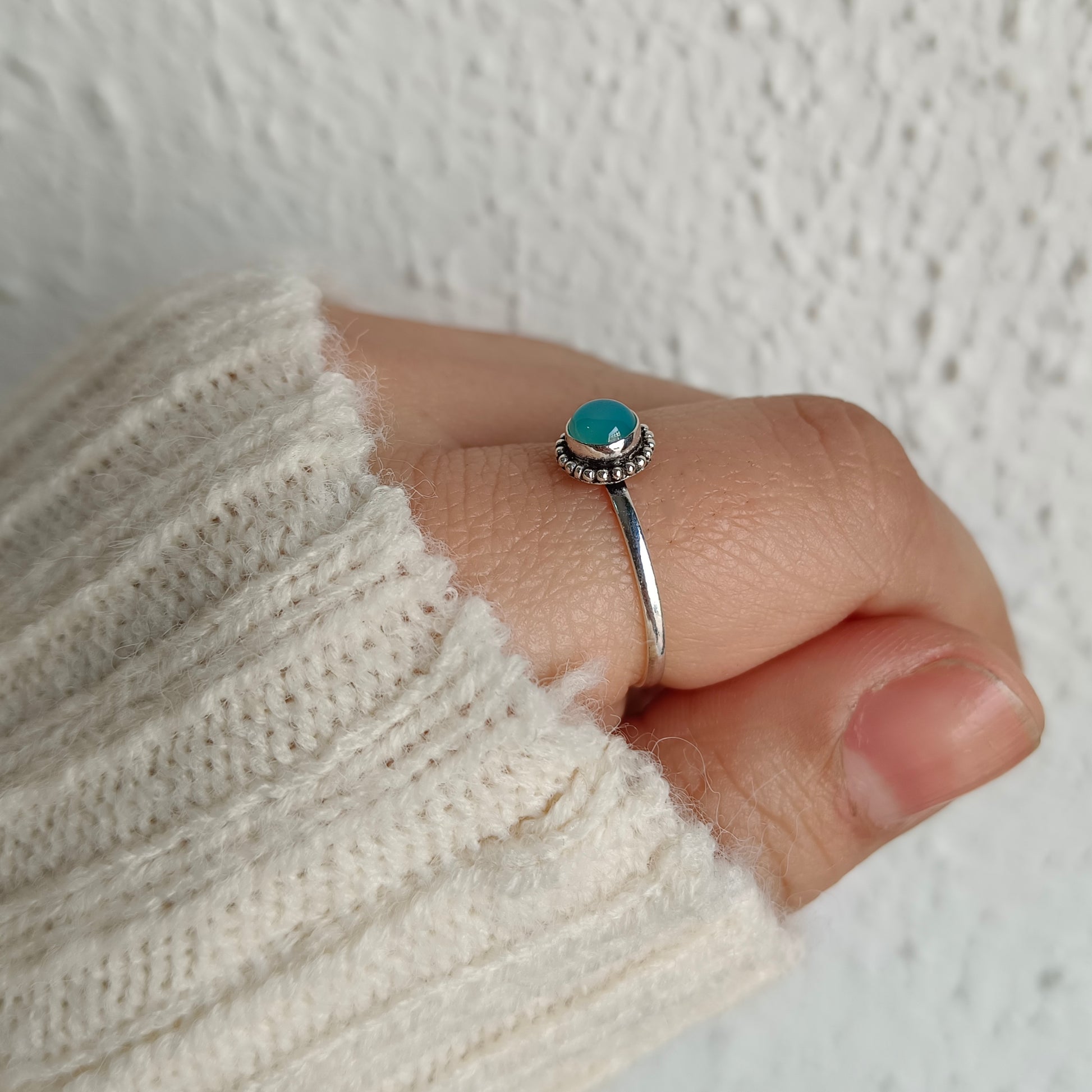 Un tesoro delicado y con mensaje. Este anillo destaca por su gema central de calcedonia —una piedra semipreciosa que calma y armoniza el espíritu— rodeada por un fino grabado con mini esferas alrededor, aportando un aire elegante y lleno de significado. Todo en Plata Fina Ley 925, hipoalergénica y certificada.