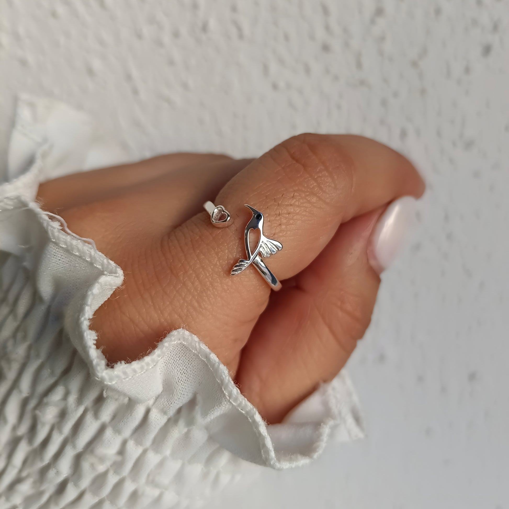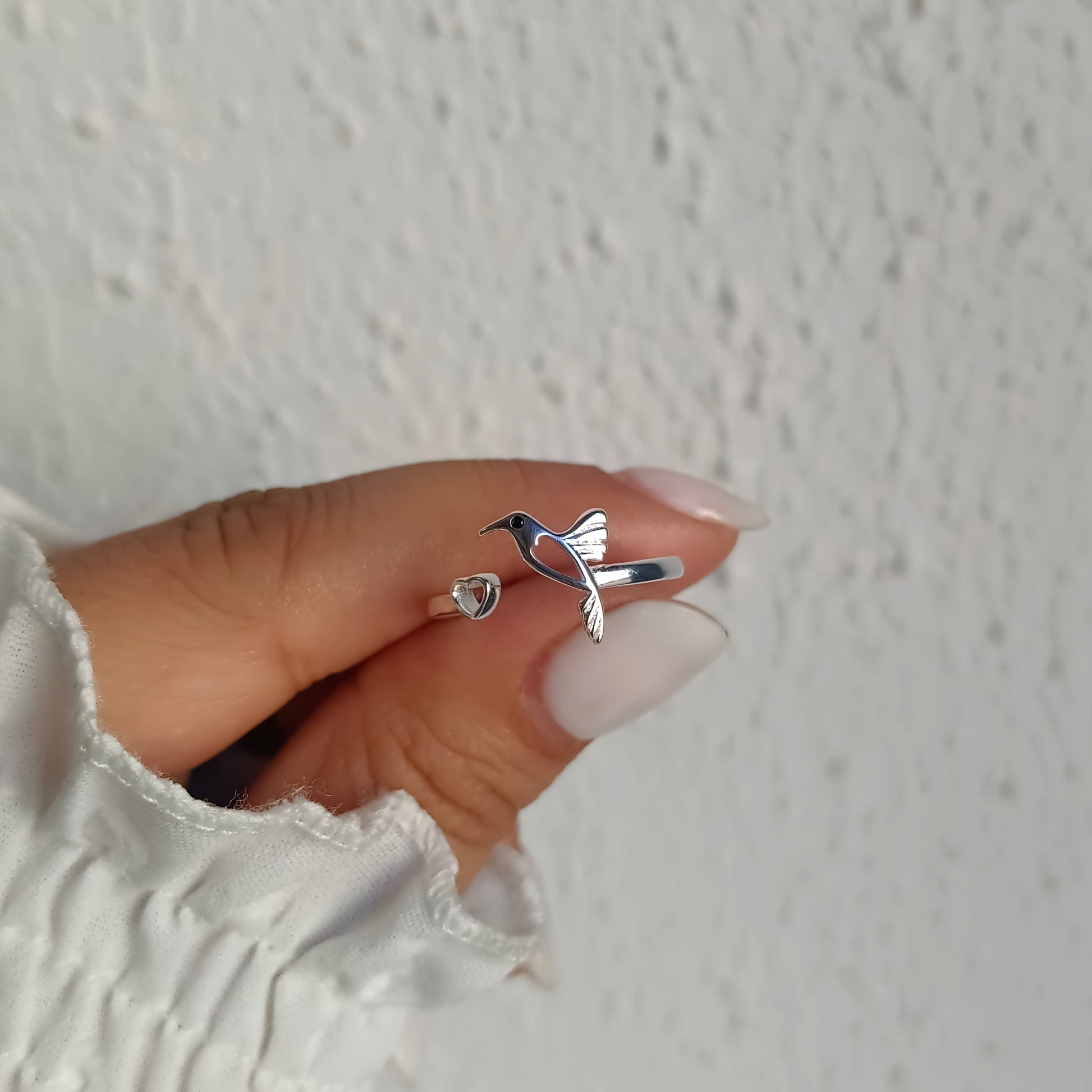 Un diseño lleno de simbolismo y ternura. Este anillo en Plata 925 presenta un delicado colibrí en vuelo junto a un pequeño corazón, representando amor, libertad y energía vital. Ideal para quienes valoran los detalles con significado y encanto natural.