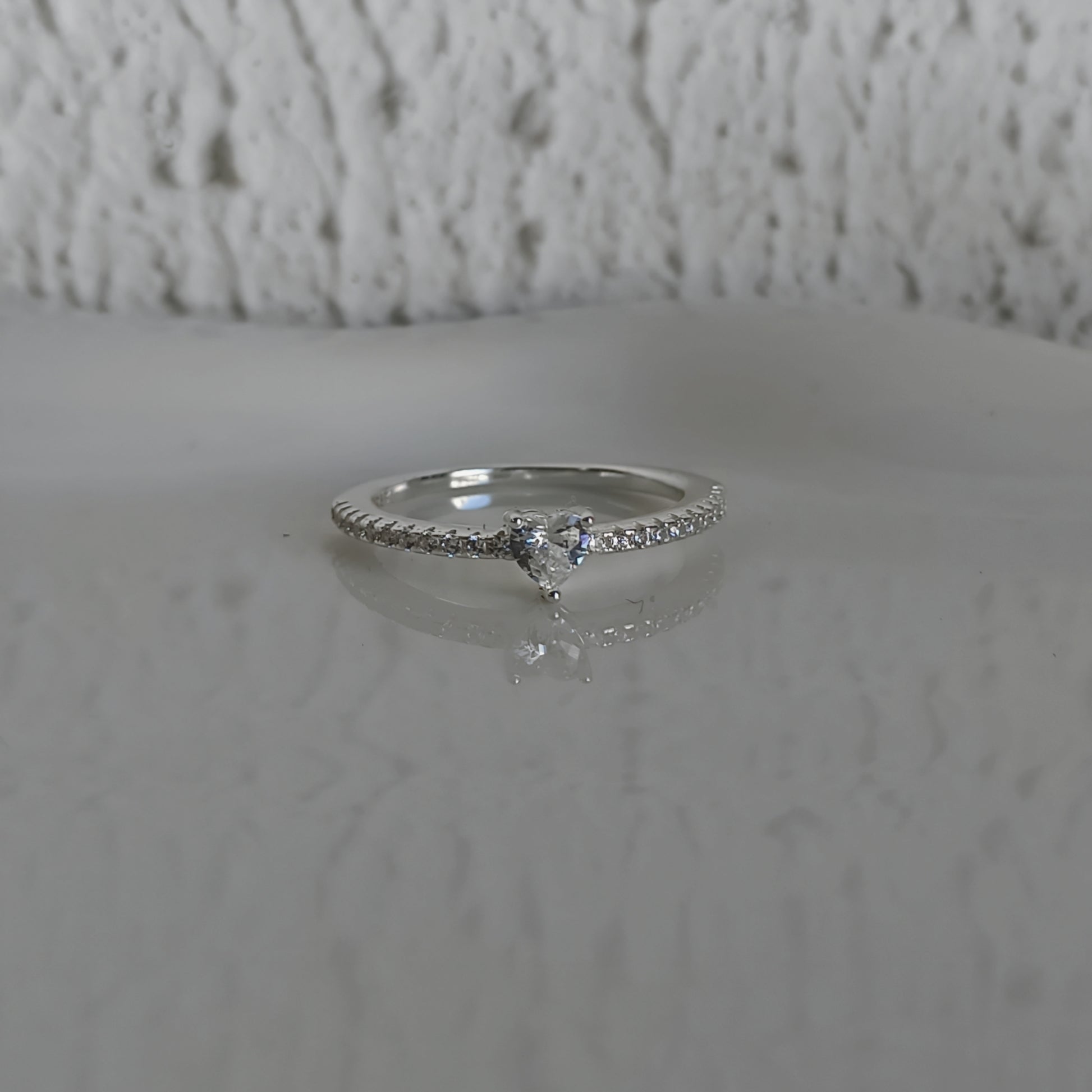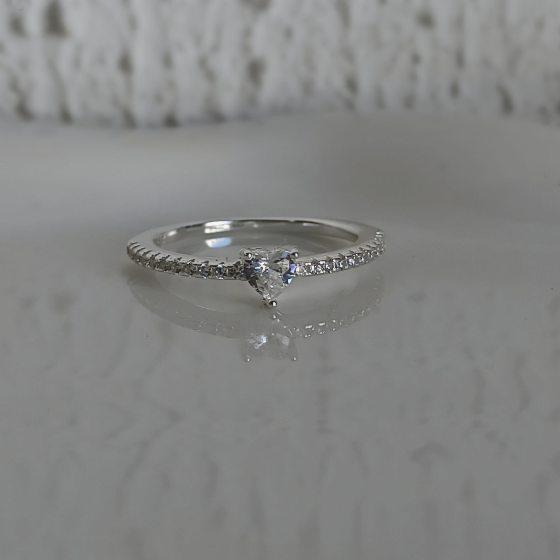 Delicado anillo en Plata 925 con un brillante circon en forma de corazón al centro y micro circones incrustados en la banda. Ideal para un look romántico, elegante y lleno de brillo. Perfecto para uso diario o como regalo especial.