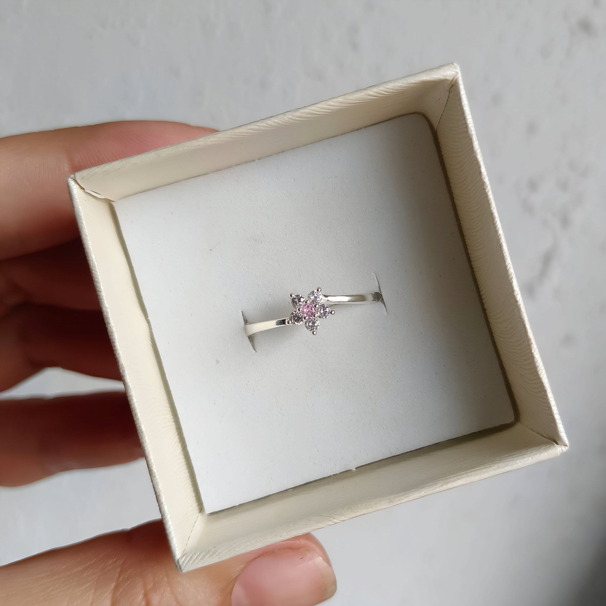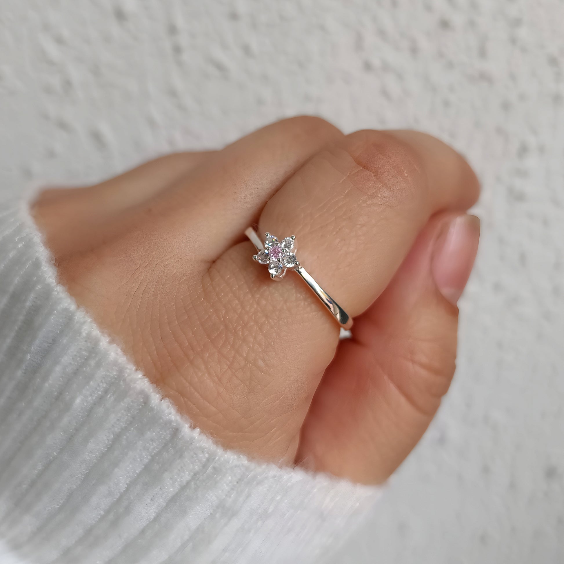 Anillo en Plata 925 con diseño de flor fina y circones brillantes. En el centro destaca un delicado circón rosado que aporta un toque romántico y femenino. Ideal para regalar o complementar un look sutil y elegante.