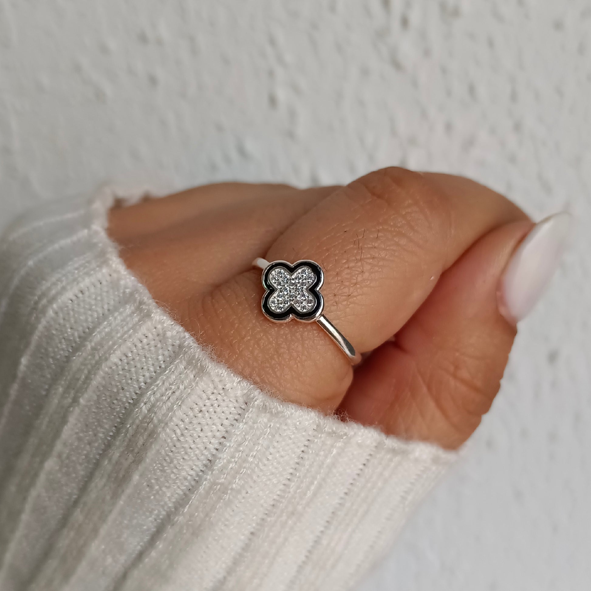Fortuna con estilo Este anillo combina el encanto clásico del trébol con un diseño moderno y llamativo. Su forma delicada resalta con circones brillantes incrustados y bordes en tono negro que le dan un toque elegante y original. El trébol, símbolo de buena suerte, convierte esta joya en un amuleto perfecto para acompañarte cada día o sorprender a alguien especial.