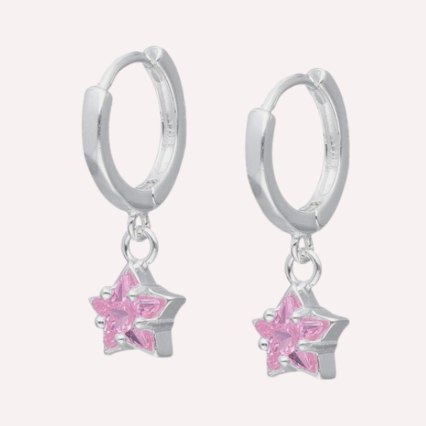 Ilumina tu look con estos delicados aros huggies en Plata 925, adornados con un dije de estrella y un brillante circón rosado. Cómodos, seguros y perfectos para uso diario o regalar.