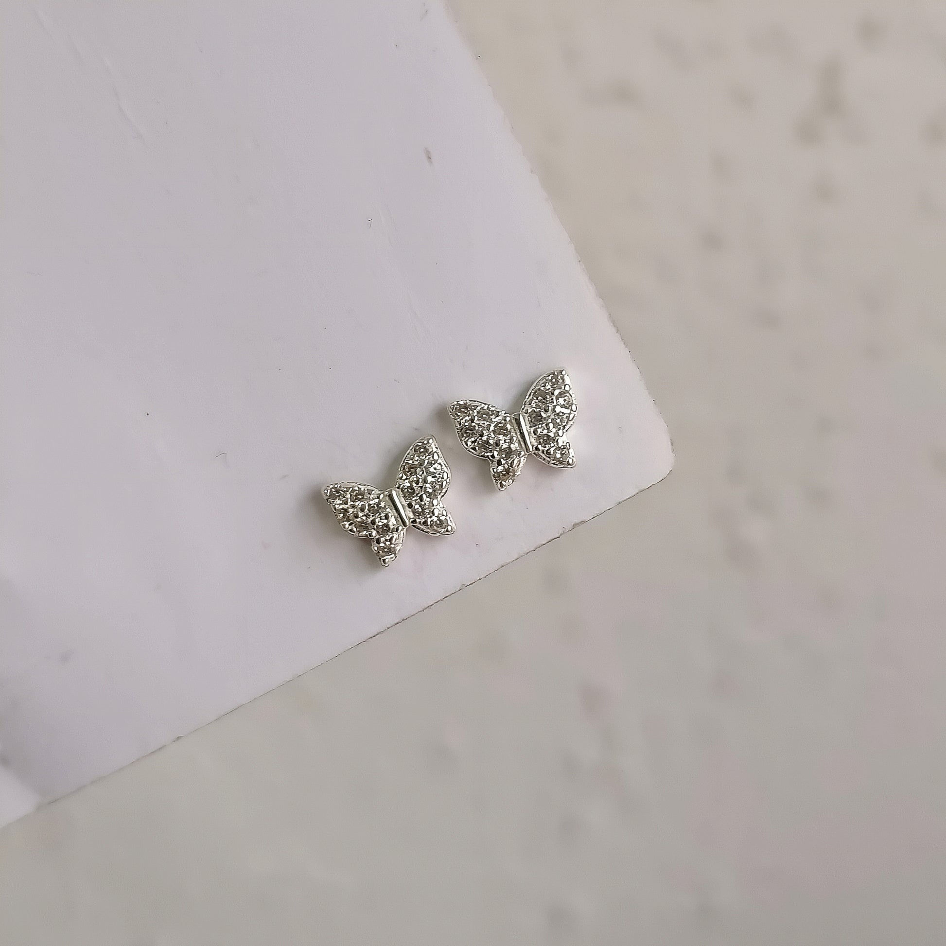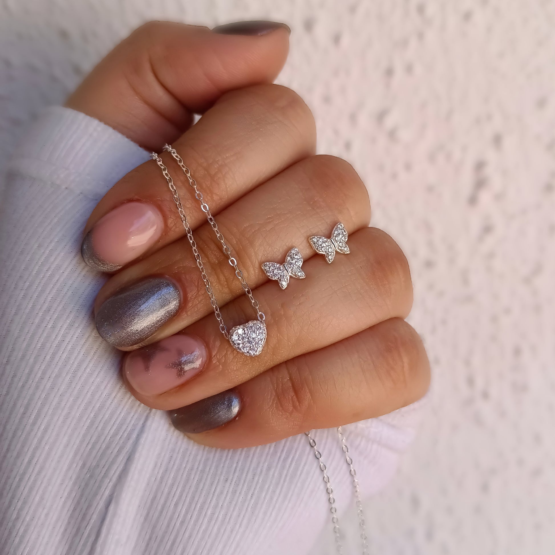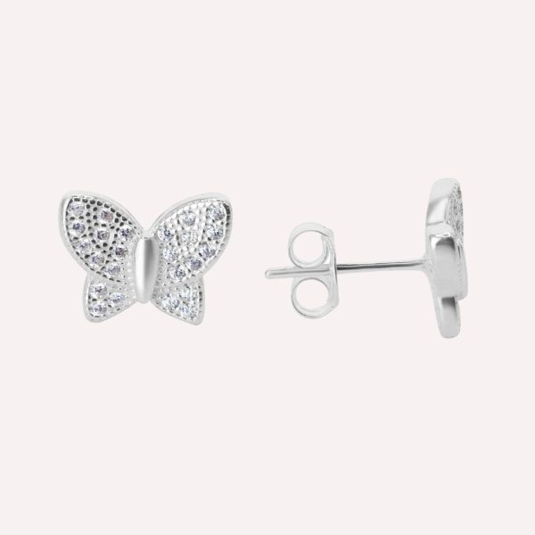 Aros mariposa en Plata 925 con circones brillantes. Un diseño que simboliza transformación, belleza y renacimiento. Su brillo sutil los convierte en el toque perfecto para acompañarte en cada etapa de tu vuelo.
