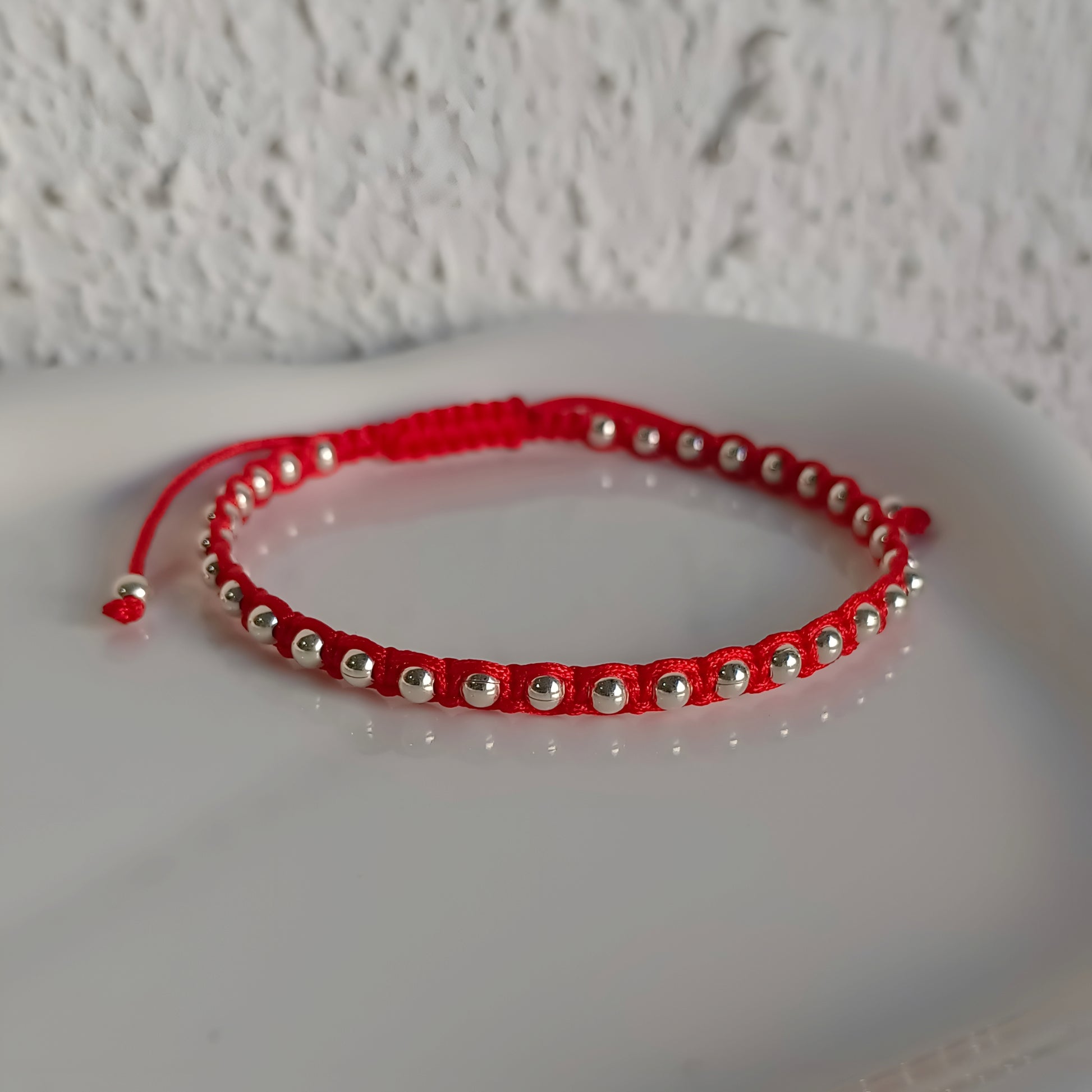 Pulsera roja tejida con bolitas en Plata 925, símbolo de protección y energía positiva. Un accesorio delicado para acompañarte cada día con estilo y significado.