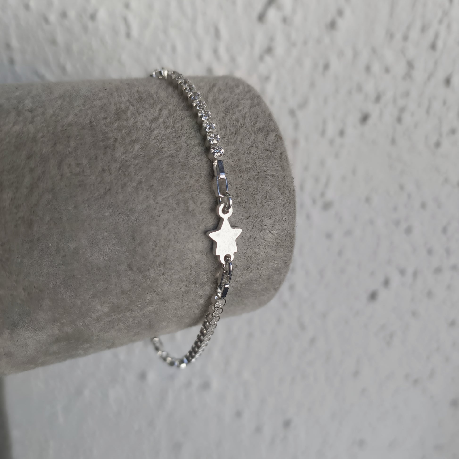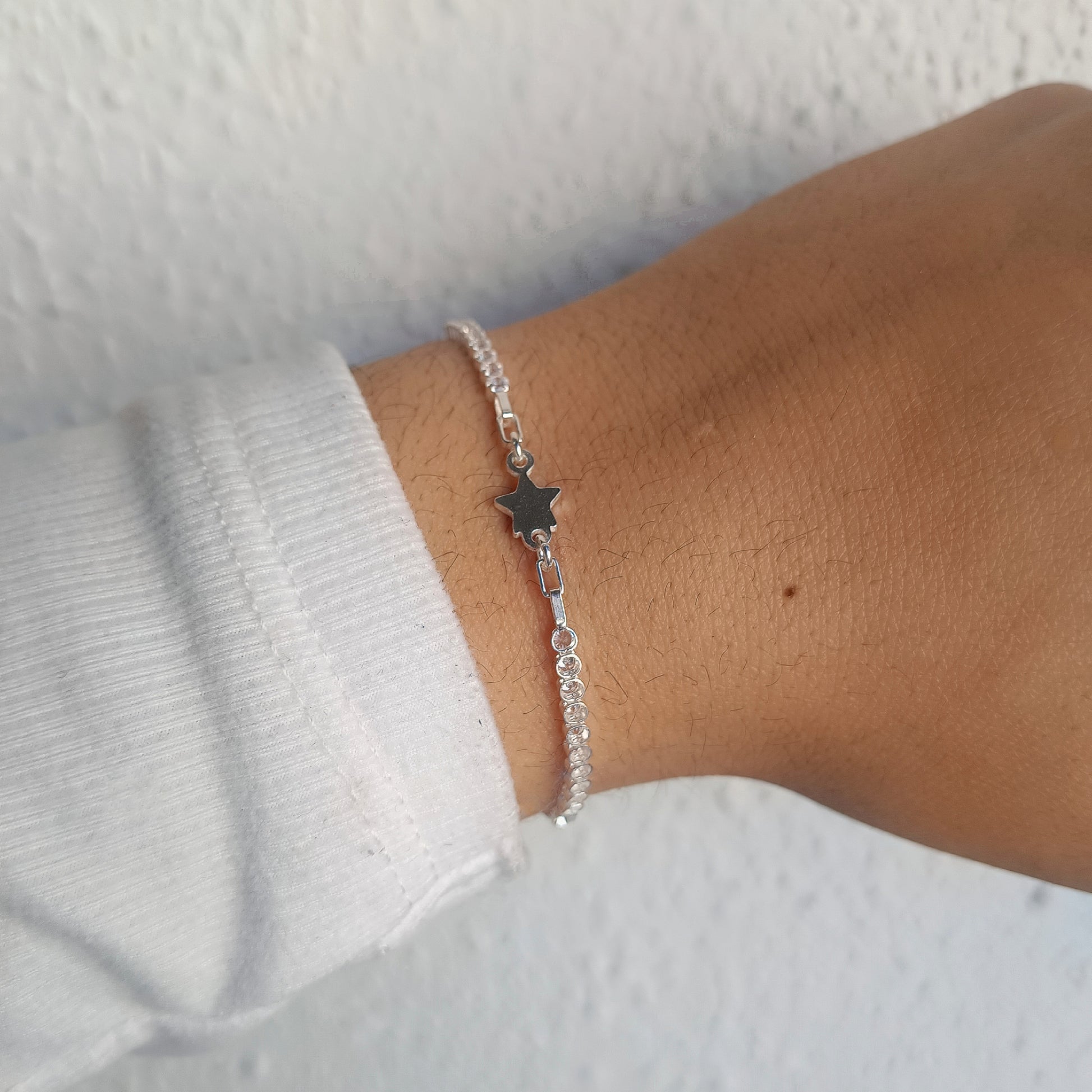 Esta delicada pulsera en Plata 925 combina una estrella central pulida con una cadena de circones brillantes que reflejan la luz con cada movimiento.